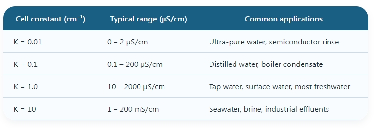 But raw conductance depends on electrode geometry — that’s where the cell constant (K) comes in.