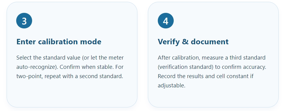 Temperature equilibrium: Always use standards at the reference temperature (usually 25°C) or allow the meter's ATC to compensate accurately.