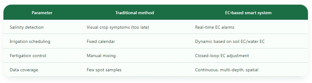 In a rice paddy study (SMART-PADDY project), wireless EC nodes in irrigation channels reduced water consumption and prevented yield loss by enabling real‑time salinity management [citation:8].