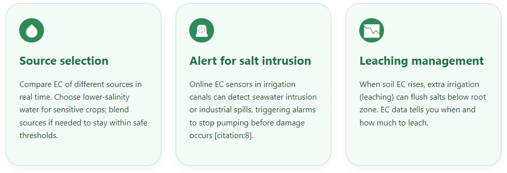 Water sources (rivers, wells, reservoirs) can vary dramatically in salinity due to drought, tidal intrusion, or upstream discharges. Continuous EC monitoring protects crops from sudden salt events [citation:4].