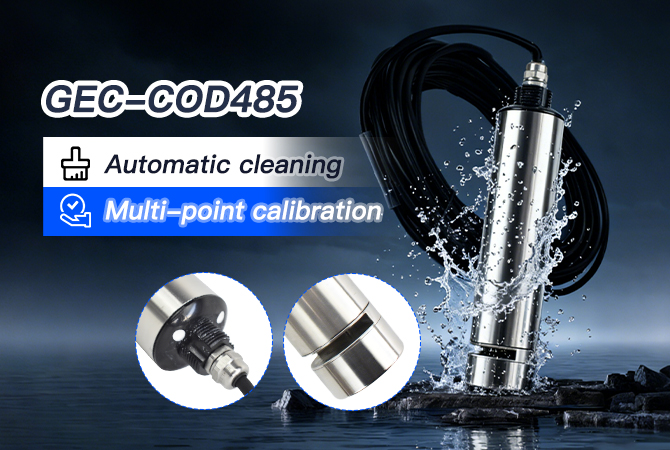 GEC-COD485 digital COD sensor features ultraviolet absorption technology, turbidity compensation, automatic cleaning and IP68 protection.