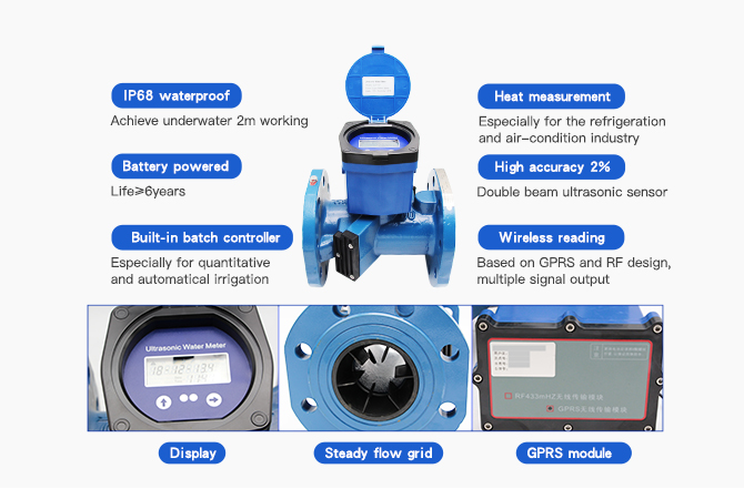 Equipped with a 58×22mm LCD display and smart touch keys, it supports bi-directional flow measurement (forward/backward instantaneous and accumulative flow) and multiple unit selection (m³, GAL, L, m³/h, GPM, etc.). Built-in lithium battery (3.6V, 19Ah) provides 6 years of service life, with optional DC8-36V external power supply.