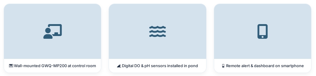 12 standardized ponds, high-density intensive farming (150 tons/year). Before upgrade: only portable DO meter, two ponds suffered massive fish kill in summer 2024 due to nighttime oxygen crash — direct loss > $28,000 USD. Frequent manual inspections but ammonia spikes remained undetected.